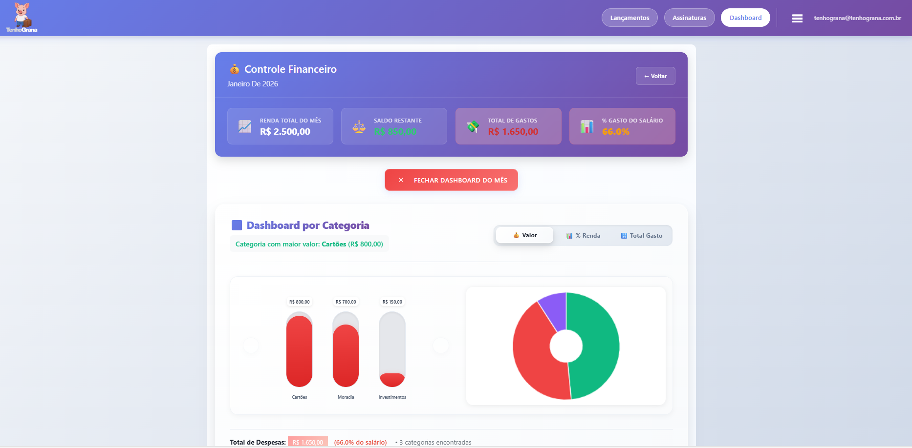 Visualização do painel financeiro conforme imagem anexada.